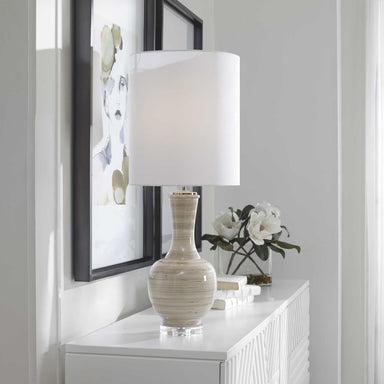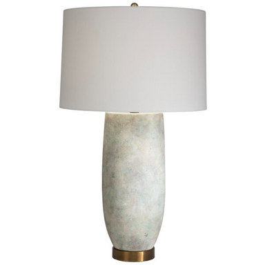 This ceramic table lamp features a wavy alternating texture finished in a light powder blue glaze with cream undertones, accented with brushed nick...