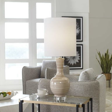 Ht. to Neck: 19”Footprint: 5”Other Dia.: 7”Max Wattage: 150Switch:3-WayHarp: 9”Finial: Brass Ball   Lamp - Pottery Shade 16x17x11″ Rnd Drum Sailclo...