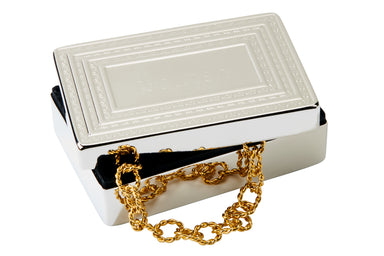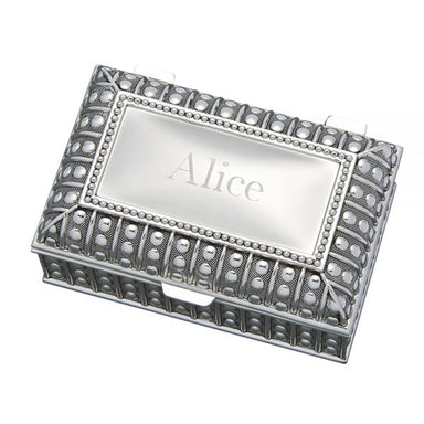 This lovely rectangular-shaped box is plated with nickel to give the box a shiny silver look that will not tarnish. It has a raised, braided edge a...
