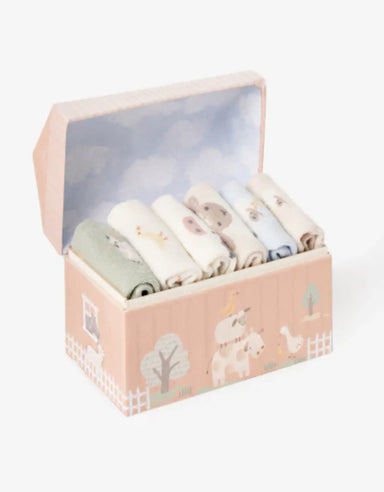 0-12 months  This baby sock set features the sweetest prints of sheep, cows, and ducklings with no-slip bottoms. These 6 socks come packaged in the...