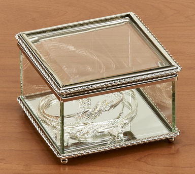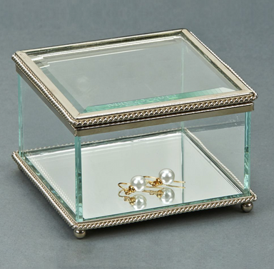 This beautiful 3.75" x 3.75" x 2.50" H square box is glass and has a hinged cover. The top and bottom edges are trimmed with a non-tarnish braided ...