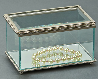 This beautiful 8" x 3.75" x 3" H rectangular box is glass and has a hinged cover. The top and bottom edges are trimmed with a non-tarnish braided b...