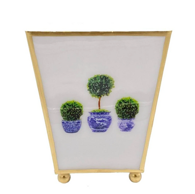 Add a pop of style to any room with this enameled wastebasket! The gold accents and Faux Bois design create an eye-catching piece for any space.