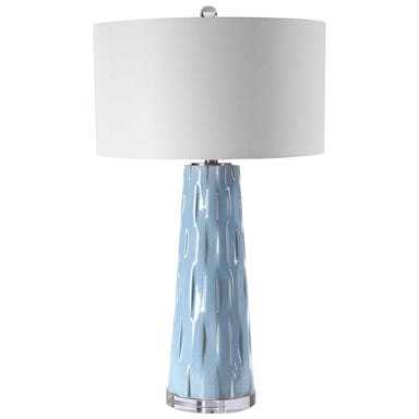 This ceramic table lamp features a wavy alternating texture finished in a light powder blue glaze with cream undertones, accented with brushed nick...