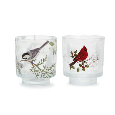 Holiday Tweet Frosted Cachepot / Tealight Candleholder Assorted 2 Designs: Chickadee with Winterberries and Red Cardinal with Holly Berries - Heavy...