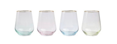Add sparkle to any setting with a gilded gold rim and varied colored glass that refracts light on the Rainbow Assorted Stemless Wine Glasses Set o...